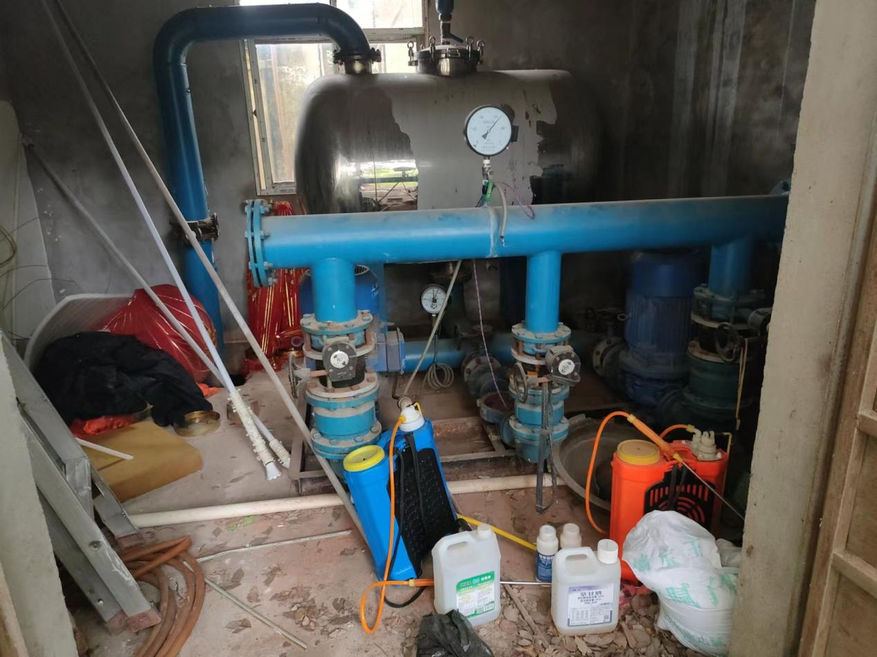 水泵房内部环境基本也是脏、乱、差,水箱人孔盖,实有不盖,导致水箱内部就存在了矿泉水瓶、饮料瓶等或其它的危害物。有的小区二供设备可能七八上十年都没有清洗、消毒过,严重的影响了居民用水安全。同时给小区物业提出了整改的意见(制度上墙、持健康证上岗、水箱定期清洗、消毒等)。