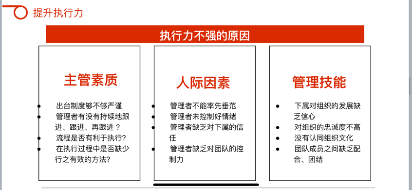 生动形象地帮助大家建立了对执行力的结构化认知,更进一步理解到了工作态度、工作职责、工作任务、工作结果的逻辑联系,以及如何在强化执行力的同时,提高部门运作效率,使效能与效率相辅相成,创造出更高的部门绩效。